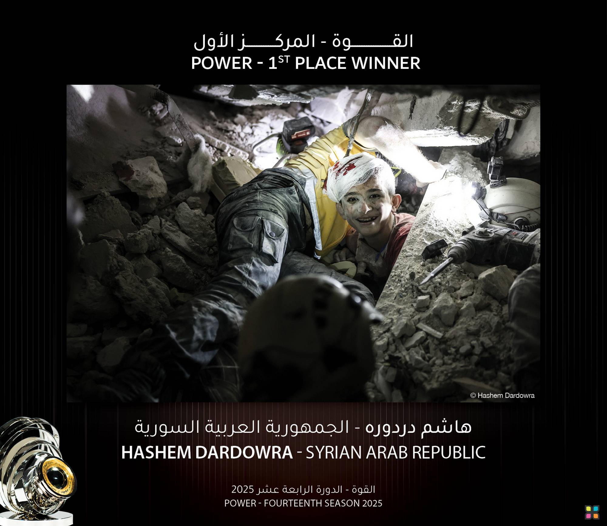 In Syria's Idlib province, and amidst airstrike wreckage, 14-year-old Khaled emerges as Syria Civil Defence (the White Helmets) free him from the rubble. Rescue teams used power drills, hand winches and acoustic probes to pinpoint the boy's position, and reduce the chance of secondary collapse, as warplanes circle above. Despite noticeable head wounds and a blood-stained bandage, Khaled manages a faint smile that signals he is responsive and defiant.